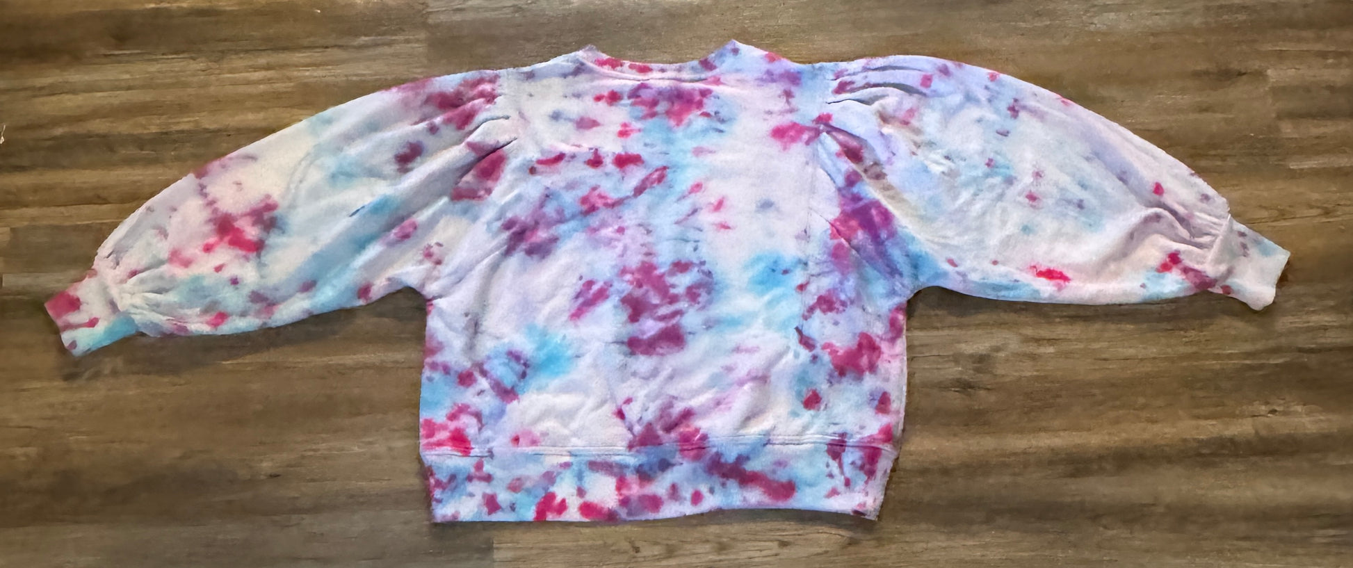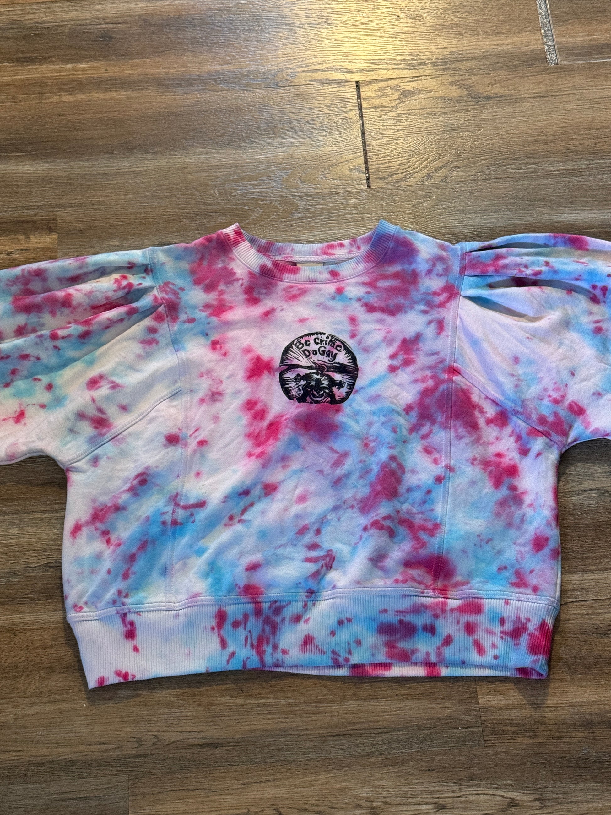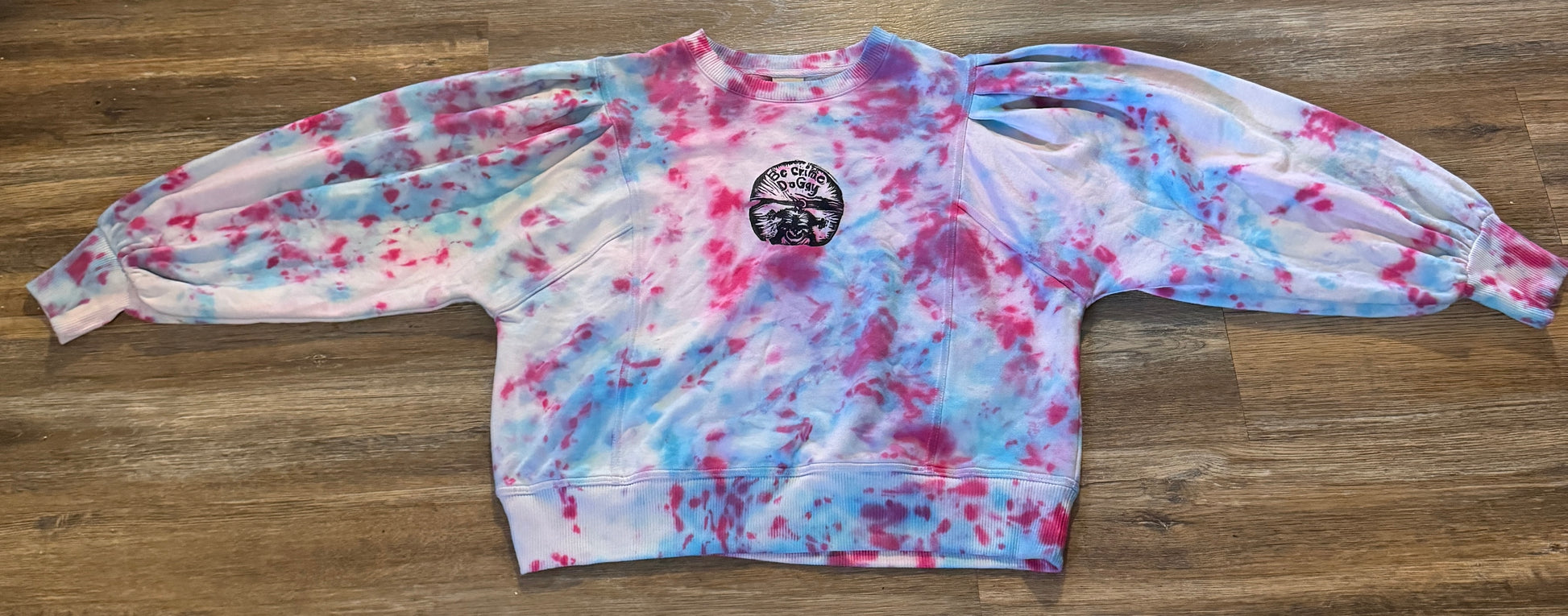 This Be Crime Do Gay Princess Sleeve Pullover was hand dyed with red and purple and was upcycled with a hand carved linoleum stamp. The stamp was applied using black oil based ink so the sweater can be washed and dried without the ink coming off. 🫧