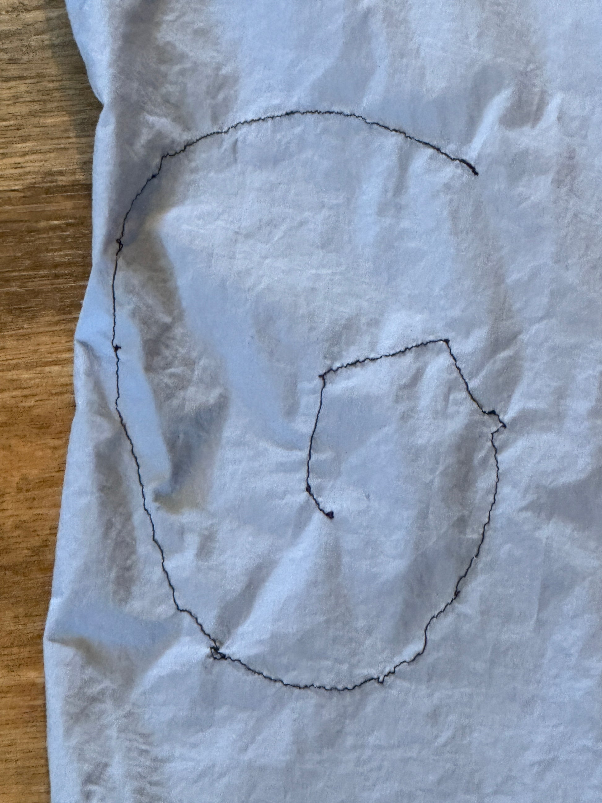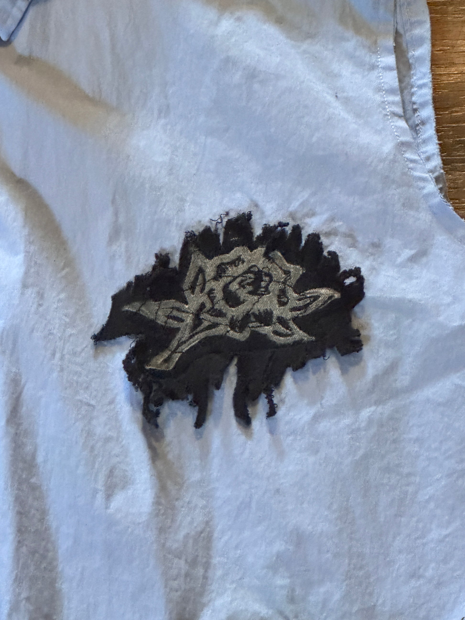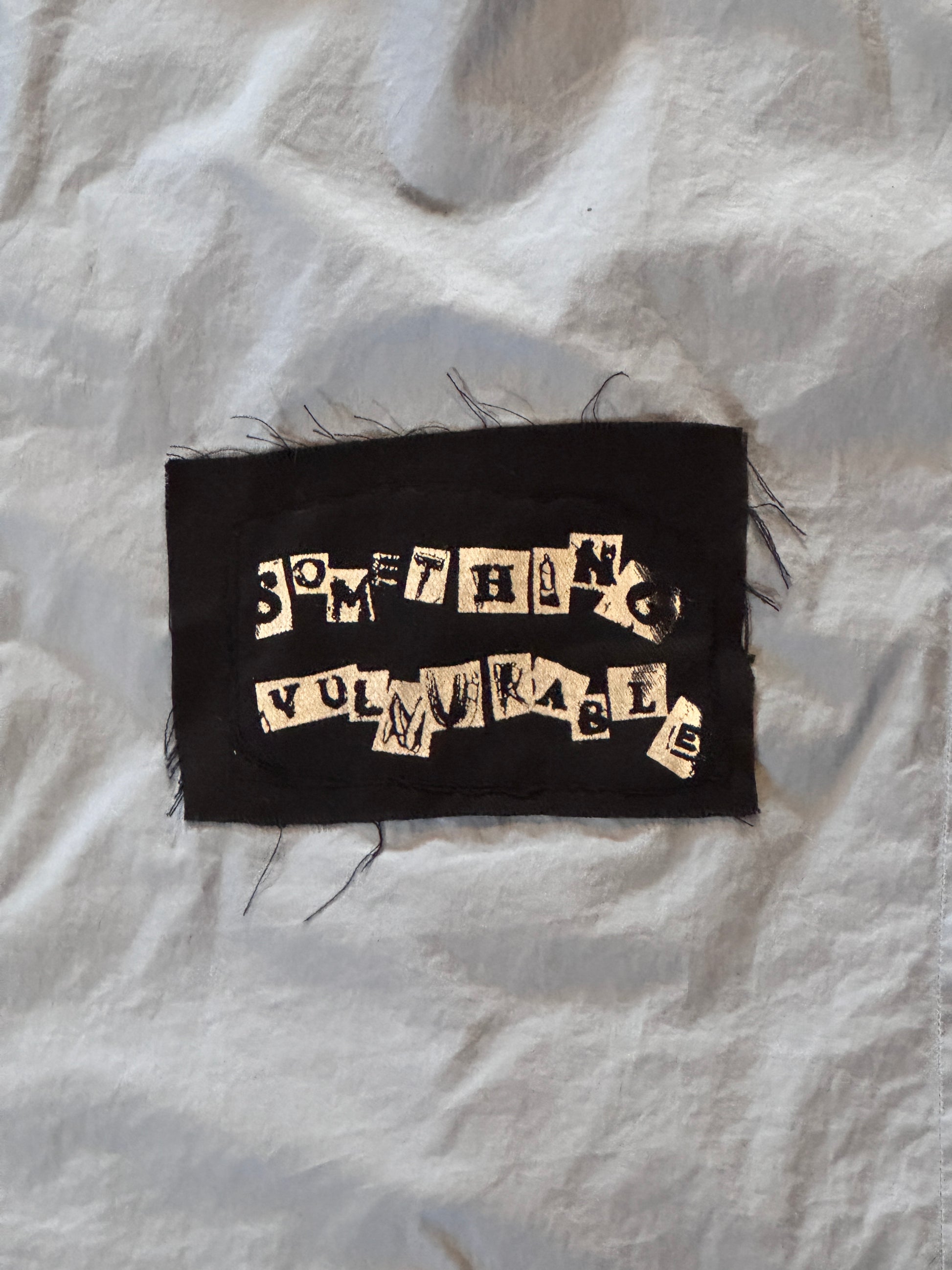 The something vulnerable and headstone patches were purchased from a small vendor based in San Jose who photographed the headstone and then transferred the image onto fabric. The two flower patches were made with Queer The Way stamps on recycled fabric. The embroidered head was created with a sewing machine. The cropped sleeves and the headstone patch have been left intentionally distressed.