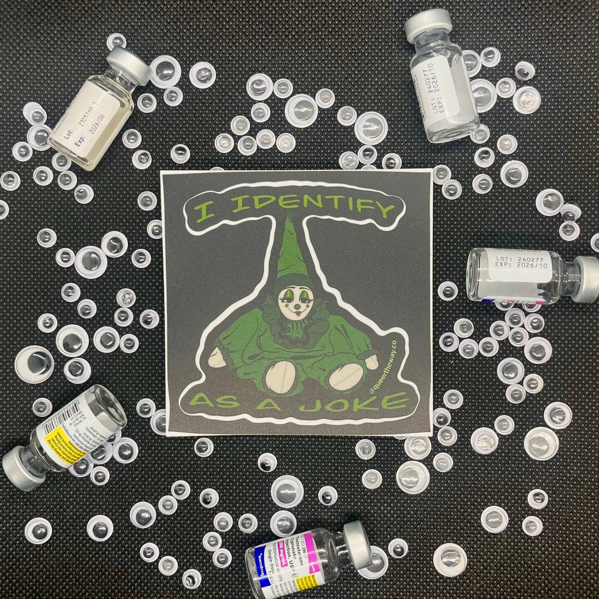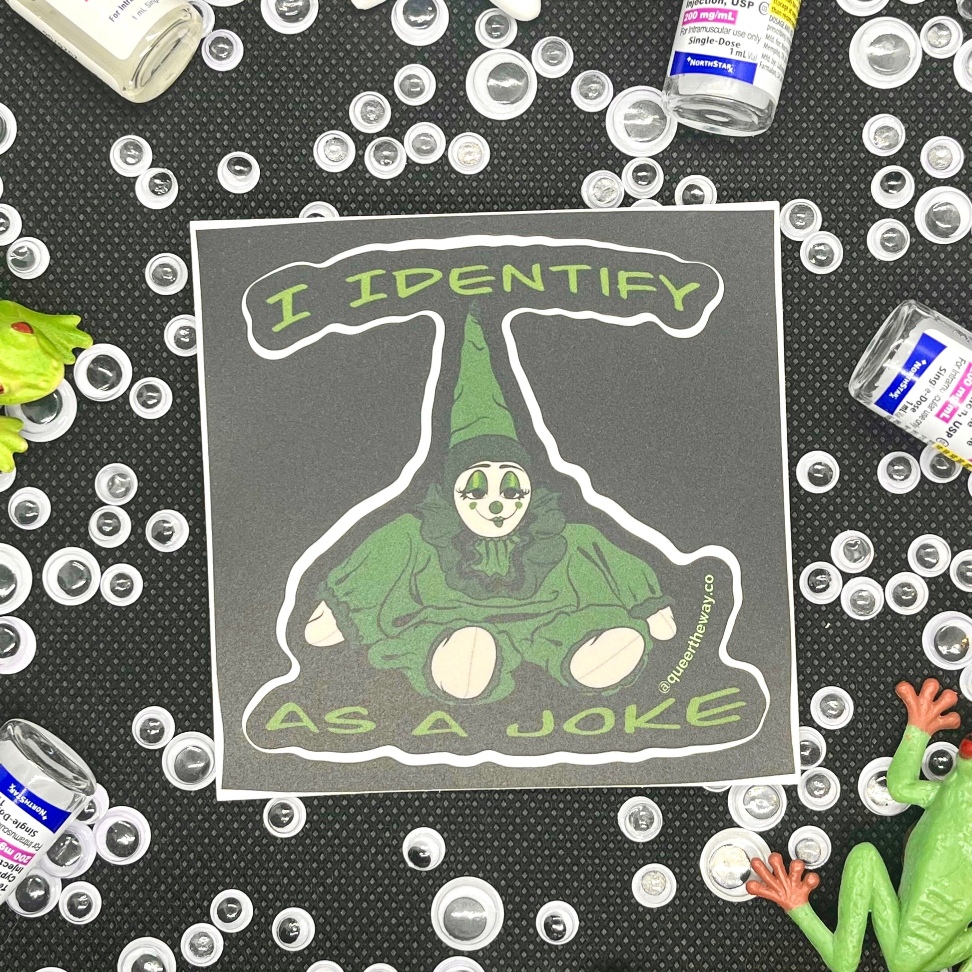 Our 3"x3" I identify as a joke sticker in green is the best way to let folks know you're here to clown around. This sticker is water and uv proof so you can put one on your car, water bottle, and laptop knowing that it will last a long time.