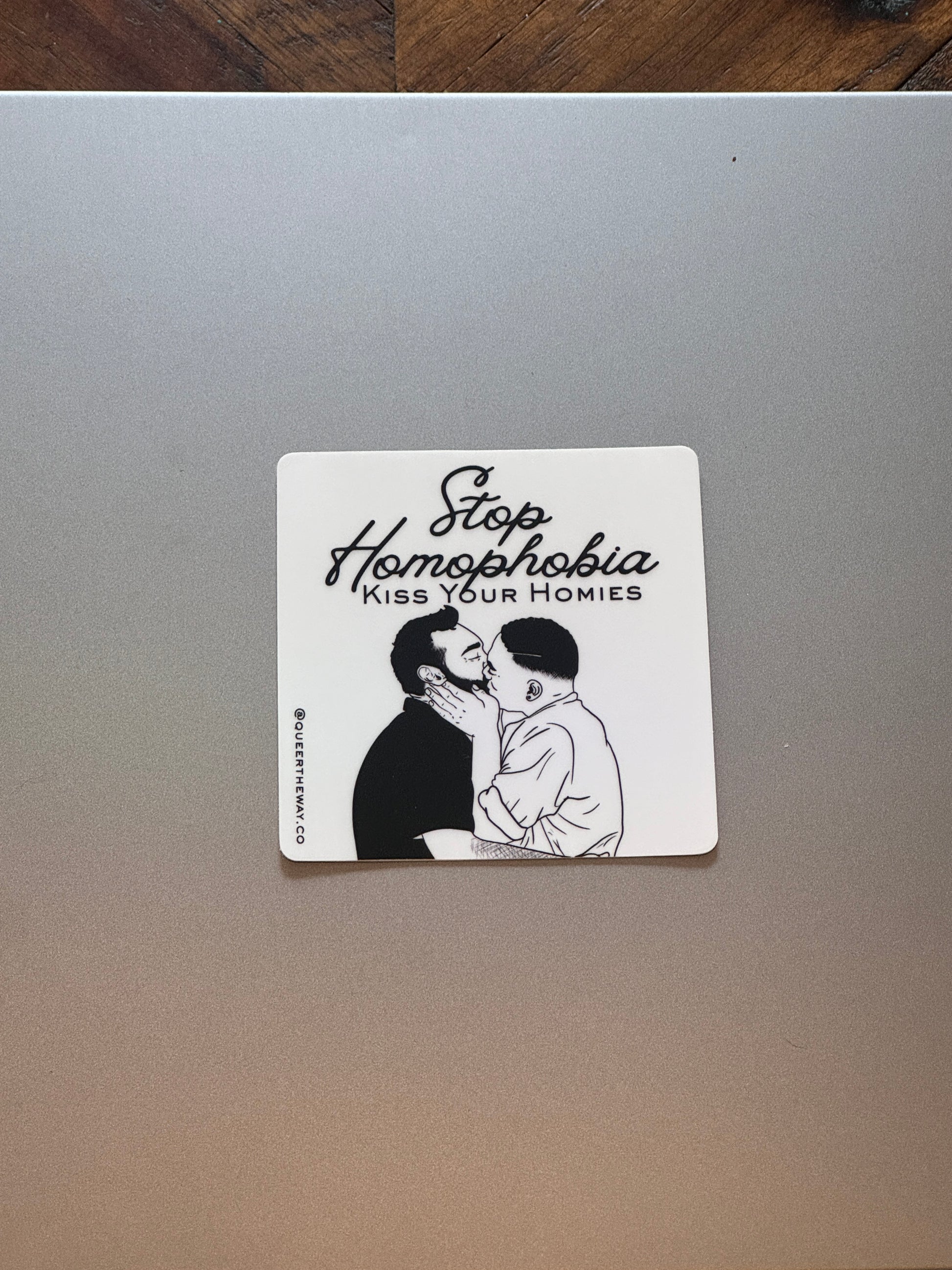 Everyone knows kissing your homies is the best way to stop homophobia. Our 3"x3" Stop Homophobia Kiss Your Homies Sticker in black and white is here to help you let you take your friendship from flirting to kissing. 😍👀